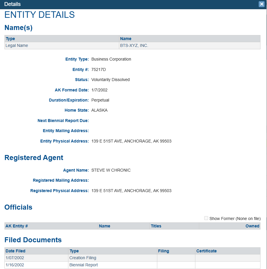 - Entity Information: Shows fundamental details, including the legal name (e.g., BTS-XYZ, INC.), entity type, entity number, formation date, status, duration, and home state.